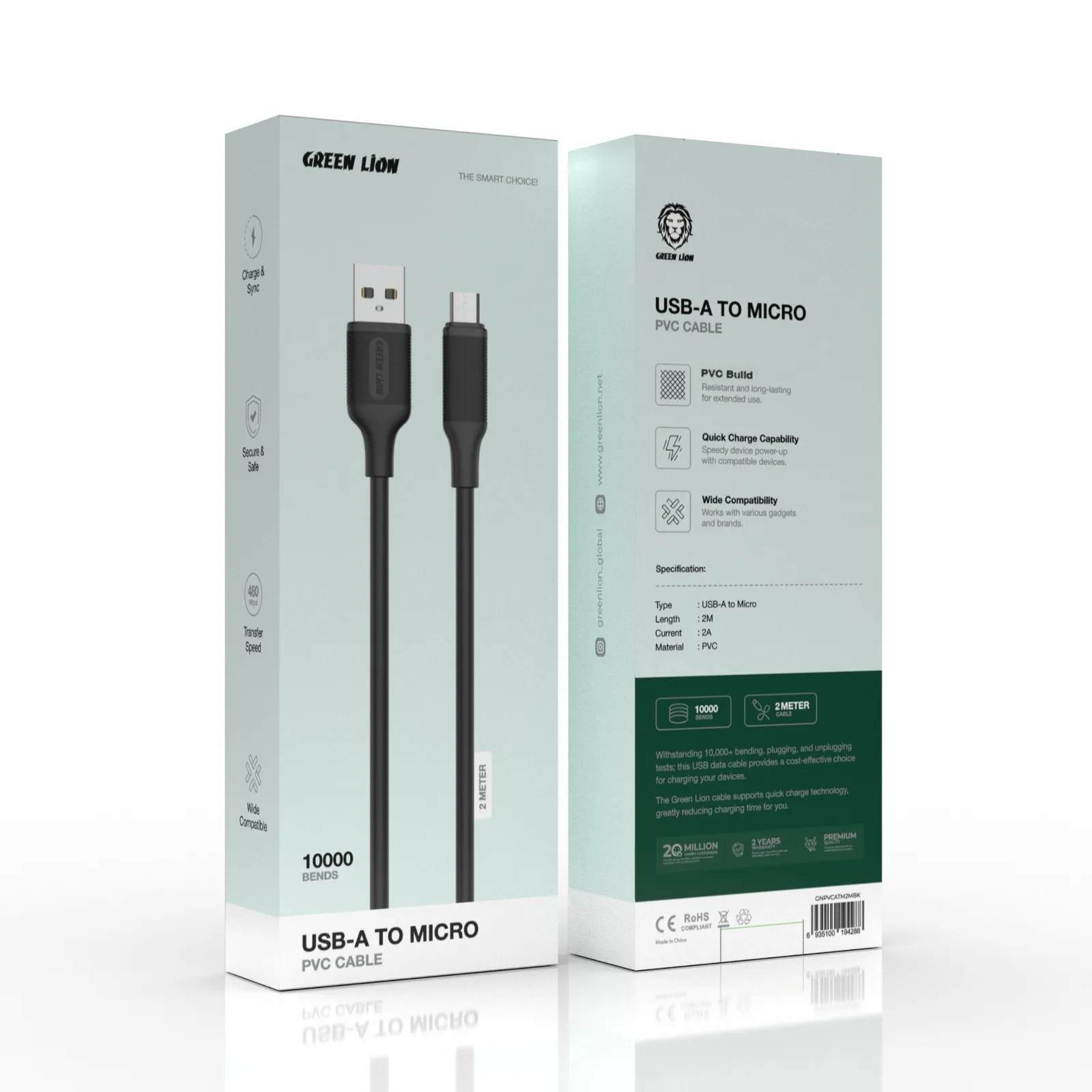{GNPVCATM2MBK} Green Lion USB-A to Micro PVC Cable 2M - Black