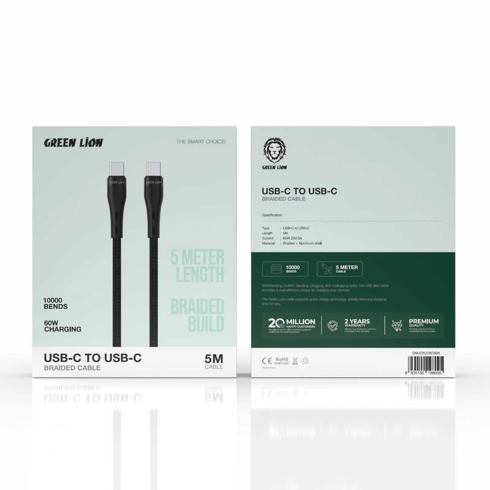 {GNUC2UCBC5BK} Green Lion USB-C to USB-C Braided Cable 5mtr 60W - Black