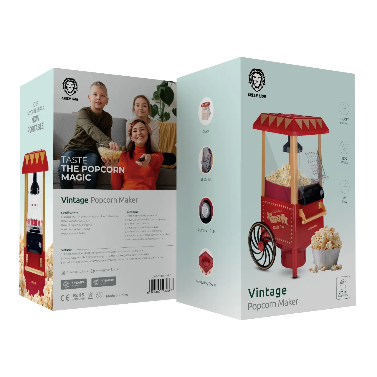 {GNVNTPOPMRRD} Green Lion Vintage Pop Corn Maker 1200W 270ML - Red